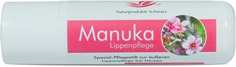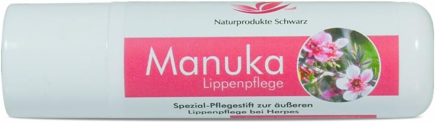 100% Natural Lip Balm against Cold Sores Effektive Care with Manuka Oil and Tea Tree Oil Free from preservatives Free of fragrances and colorants Product description Naturprodukte Schwarz Manuka Lip Salve Lip Stick 3.5 grams Indications Nourishes the lips stressed by herpes with natural ingredients and active ingredients. Manuka lip care is made with valuable organic oils such as organic jojoba oil, organic olive oil and organic shea butter. The lips receive additional intensive care thanks to natural waxes from wild growth and organic cocoa butter. The vegan formula is 100% free from preservatives, colours and synthetic fragrances. P.when('A').execute(function(A) { A.on('a:expander:toggle_description:toggle:collapse', function(data) { window.scroll(0, data.expander.$expander[0].offsetTop-100); }); }); Ingredients Olea europaea fruit oil, Rhus verniciflua peel cera, Copernicia cerifera cera, Candelilla cera, Ricinus communis seed oil, Butyrospermum parkii butter, Simmondsia chinensis seed oil, Theobroma cacao seed butter, Cetyl alcohol, Leptospermum scoparium branch/leaf oil, Cymbopogon winterianus heritage. b oil, b oil, b oil, b piperita oil, tocopherol, Melissa officinalis leaf oil, geraniol, helianthus annuus seed oil, citronellol, citral, linalool, limonene, eugenol. Directions 1. Apply the lip balm as often as desired.