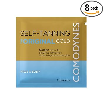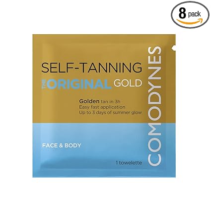 The Original Gold self-tanning wipes offer a simple and effective way to achieve a natural and even tan on the face, neck and décolleté. In just 3 hours you will get a beautiful golden tan that adapts to your natural skin tone The self-tanning wipes contain a moisturising complex that avoids dry skin. They are free from parabens, fragrances, allergens, dyes and sunscreens. Made from 100% natural biodegradable fibers, oil free Comodynes - Products are created in Dermofarm laboratories by professionals and scientists with the latest technology. Strict quality, safety and effectiveness controls are complied with Self tanning wipes offer many benefits: easy application, even tan without streaks or stains. The tanning intensity adapts to your skin tone for a natural look. Suitable for face, neck, cleavage or half legs. Up to 4 days long lasting tan Apply to clean, dry skin and wash hands. The tan develops within 3 hours. The pack contains 8 wipes and provides a quick solution for a natural tan Product Description Gold Finish Self Tanning Wipes provide a simple and effective way to achieve a natural and long-lasting tan on the face, neck and décolleté. With their special formula that adapts to the natural skin tone, they avoid excessive or orange colouring. The wipes contain a moisturising complex that avoids dry skin and provides a smooth skin feeling. They are free from parabens, fragrances, allergens and dyes and are made from 100% natural and biodegradable fibres. Application is easy and convenient, and the long-lasting tan lasts up to 4 days. With the self-tan