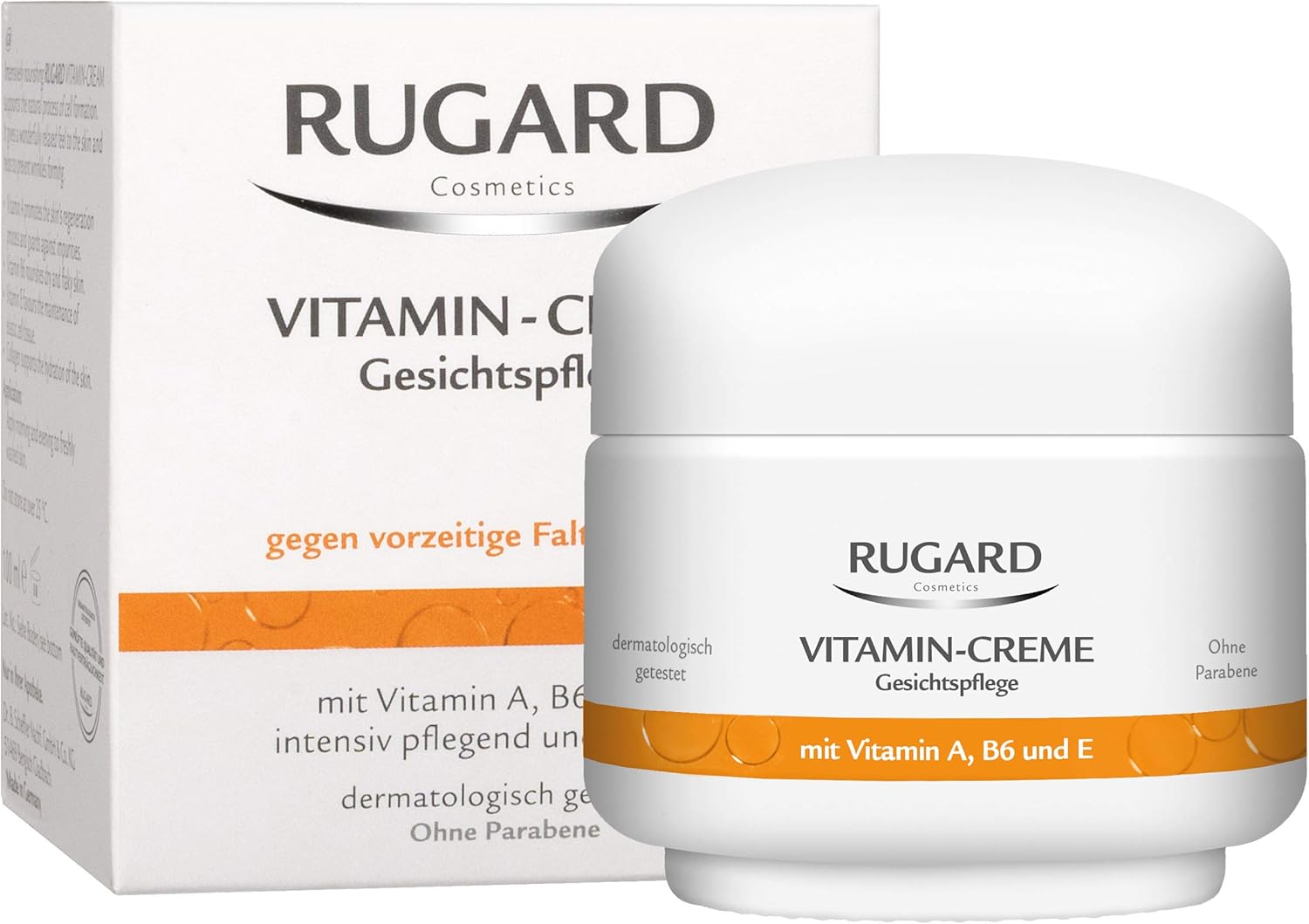 Anti-ageing effect: RUGARD vitamin cream counteracts premature skin ageing and wrinkles on the face thanks to the collagen-vitamin combination Rich care: the combination of valuable vitamins, panthenol, avocado and soy oil intensively nourishes the skin and provides it with long-lasting moisture Selected vitamins: Vitamin A (retinol) smooths the skin. Vitamin E improves moisture retention. Vitamin B6 promotes regeneration processes. For a radiant complexion DAILY CARE ITUAL: The vitamin cream from RUGARD is ideal for daily skin care. It contains no parabens and is dermatologically tested RUGARD - Quality: Whether lotion, mask or cream, at RUGARD high-quality ingredients are carefully combined and tailored to the needs of the skin. RUGARD - Feel the Difference