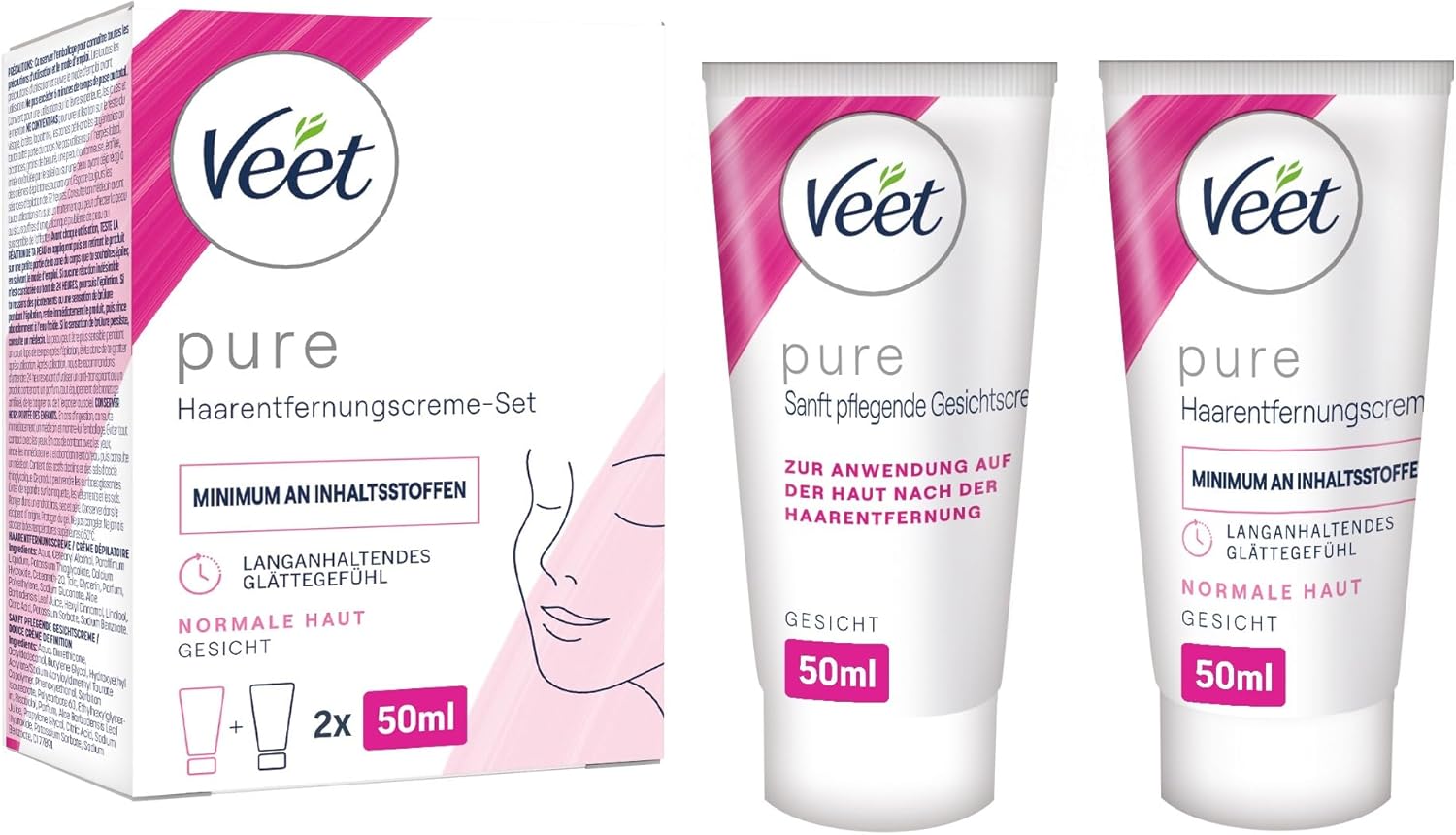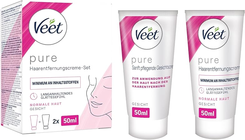 Specially formulated for use on upper lip, cheeks and chin 24 h moisturising. For normal skin With grape seed oil: Works close to the root even on short hair Product Description Veet Pure Hair Removal Cream Set Face - for Normal Skin Are you looking for a way to remove unwanted hair on your face without having to reach the razor? With the Veet Pure hair removal cream set for the face, annoying hairs on the upper lip, chin, cheeks or eyebrows can be easily and quickly removed. The hair removal cream contains a minimum of ingredients and smells surprisingly good, without ammonia smell. The cream removes unwanted hair and provides a long-lasting smoothness. For uncomplicated hair removal without shaving - and thus less risk of cuts and annoying stubble immediately after shaving. The hair removal cream is particularly suitable for hair removal of facial areas such as upper lip, chin, cheeks and eyebrows. It is suitable for normal skin and dermatologically tested. The included care cream provides a silky soft feeling on the facial skin after hair removal. Quick and easy hair removal. Facial skin care cream For a long-lasting smoothness. Minimum ingredients. Dermatologically tested. Pleasant fragrance without ammonia smell Suitable for normal skin Important notes: Store outer packaging with the full important instructions and instructions (English language not guaranteed). Read and follow all important instructions and instructions before use. Do not leave for more than 6 minutes in total. Suitable for upper lip, cheeks and chin. Not suitable for the rest of the fa