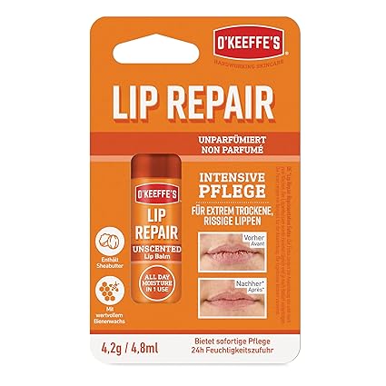 This highly effective lip balm relieves, hydrates and protects extremely dry, cracked lips. Provides a flexible protective layer and hydration for dry, cracked lips. All-day protection against dryness, even when eating and drinking. Quick retraction for soft, gentle lips. Matt finish, unperfumed, hypoallergenic. Product Description O'Keeffe's Lip Repair's highly effective formula soothes, moisturises and helps repair extremely dry lips so they feel soft, smooth and healthy all day. O'Keeffe's Lip Repair provides long-lasting moisture for up to 24 hours and is clinically proven to work with just one application. With seven moisturisers and conditioners, O'Keeffe's Lip Repair continues to work while eating and drinking. For best results, apply O'Keeffe's Lip Repair to lips in the morning and enjoy intense moisture and protection all day long. Available in Unscented, Cooling Relief or SPF. Directions Apply the lip balm to the lips as desired P.when('A').execute(function(A) { A.on('a:expander:toggle_description:toggle:collapse', function(data) { window.scroll(0, data.expander.$expander[0].offsetTop-100); }); }); Safety Warning Do not use in case of irritation or unwanted reactions. See more