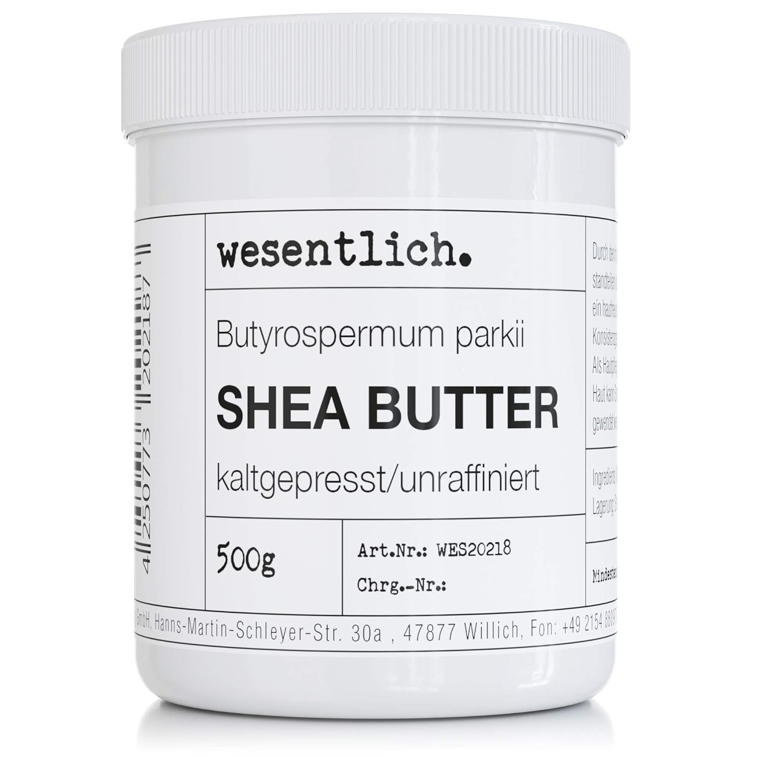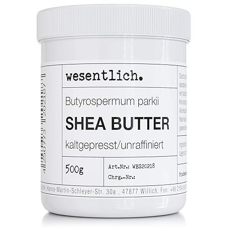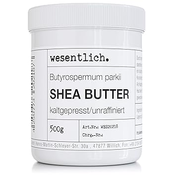 Cold-pressed shea butter / raw: fine body butter with an ideal consistency for high-quality cosmetic products. Unrefined shea butter 1000 g is often used in combination with various oils as a balm, but can also be used as a body butter pure. The nourishing power of nature. Shea butter is a popular ingredient in cream, hand cream, cleanser, body lotion, conditioner and shampoo. Butyrospermum Parkii (botanical name). 100% pure shea butter without additives or preservatives: only the essentials. wesentlich is known for its high-quality essential oils and scented oils.