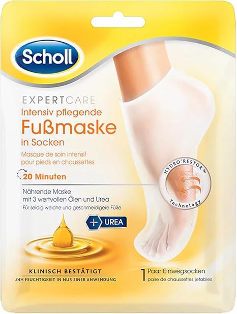 Long-lasting feeling of supple feet: The intensive foot mask with 3 valuable oils nourishes and moisturises stressed feet after only 20 minutes of exposure Effective moisturizing care has been clinically confirmed: thanks to the HydroRestor technology, the nourishing cream is absorbed in just 20 minutes and ensures a long-lasting feeling of supple feet With valuable ingredients such as avocado, jojoba and argan oil, glycerin, urea and shea butter, the mask provides the foot with sufficient moisture / Without washing up and without greasy Easy to use at home: for example, after peeling or after treatment with the Scholl electric corneal remover, slip into the sock and let the care take effect for 20 minutes Scope of delivery: 1 x EXPERTCARE intensive care foot mask from Scholl / With 3 valuable oils / Moisturizes / Developed and evaluated with foot care specialists Product Description Scholl Expertcare Intensive Nourishing Foot Mask in Socks Well-groomed feet in no time at all: the Scholl Expertcare care socks are the answer to dry and stressed feet! They care for a long time. lasting and ensure a smooth skin feeling. Thanks to the innovative HydroRestor technology, the foot is evenly moisturised. coats and shows first results after just 20 minutes - for beautiful and healthy feet! The world is at our feet... Moisturising disposable socks Material: plastic. Intensive foot care - easy to use and without greasy. For use alone, after peeling or after removal of Excess calluses with the Scholl callus remover. 100 years of experience - science at the service of the
