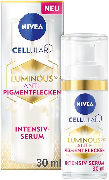 Cellular Luminous - the Nivea Cellular Luminous intensive serum reduces 3 types of pigment spots and ensures an even and radiant skin Patented active ingredient: After 10 years of research and testing of over 50,000 ingredients, NIVEA has developed the innovative, patented active ingredient Luminous 630 Triple action - the serum reduces pigment spots caused by sun, skin ageing or hormonal changes and prevents new pigment spots from developing Easy to use - apply the facial care serum in the morning and evening to the cleansed skin. The skin compatibility is dermatologically approved Box contents and details - Nivea Cellular Luminous 630 anti-pigment spot intensive serum, 30 ml, pigment spots cream, item number 94429 Product Description NIVEA Cellular Luminous 630 intensive serum - reduces the 3 types of pigment spots.After 10 years of intensive research and testing of more than 50,000 ingredients, NIVEA has developed the innovative, patented active ingredient Luminous 630 for the reduction of pigment spots.For even and radiant skin, the light Cellular Luminous 630 intensive serum reduces pigment spots caused by sun, skin ageing or hormonal changes such as pregnancy or menopause. In addition, the facial serum prevents their new development. It is gentle on the skin and is suitable for all skin types - even for sensitive skin. After just 4 weeks, the skin is visibly brightened and even, after 8 weeks, pigment spots are reduced by up to 50%. For naturally even and radiant skin: Cellular Luminous 630 anti-pigment spots intensive serum.Application:Apply the anti-p