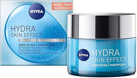 Hydra skin effect - The refreshing formula with pure hyaluronic activates the skin's own hyaluronic production* from the inside out - for plump, smooth skin (*in vitro). Pure hyaluron: This valuable ingredient contained in the Hyaluron gel goes through an elaborate treatment process that makes it into its pure form. 72 hours of moisture: the lightweight gel cream melts into the skin and moisturises for 72 hours. It plumps the skin with moisture from the inside out. Refreshed skin feeling - with every use, the moisturising gel leaves a refreshed skin feeling. Skin compatibility has been dermatologically tested. Box contents and details: Nivea Hydra Skin Effect Wake-up Gel, 50 ml, day cream gel for visibly smoother skin and a fresher complexion, without oily skin feeling, item number 94201. Product Description Nivea Hydra Skin Effect Wake-up Gel Day Cream - for Plumped and Smooth Skin The Nivea Hydra Skin Effect Wake-up Gel activates the skin's own hyaluronic production from the inside out and thus ensures plumped, smooth skin. The day cream with pure hyaluronic acid [HA] activates the skin's own hyaluronic production* from the inside out. For this purpose, the valuable ingredient goes through an elaborate preparation process that puts it in its pure form. Thanks to its lightweight formula, the face cream moisturises for up to 72 hours and plumps the skin with moisture from the inside. This ensures visibly smoother skin and a fresher-looking complexion without leaving greasy residue on the skin. The light texture of the gel blends with the skin and leaves a ref