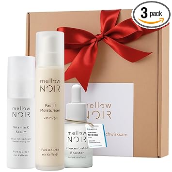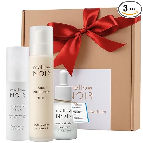 Highly effective natural cosmetics: immediately firming 15 ml hyaluronic serum against wrinkles and wrinkles, provides your skin quickly and intensively with moisture, up to 39.5% better skin roughness after 30 minutes. The 50 ml facial moisturiser provides your skin with moisture over 24 hours - say goodbye to dry skin! 30 ml anti-ageing serum with double vitamin C power prevents light-induced skin ageing and reduces the oxidative stress of your skin. The beauty innovation: active coffee oil made from 100% consumed coffee - refined with state-of-the-art active ingredients. Our coffee oil stimulates collagen production, can reduce wrinkles, supports the rapid regeneration of your skin and prevents light-induced skin ageing. Complemented by ectoin, nature's stress protection molecule, the strengthening extract of fresh cherry blossoms of Provence and natural vitamin C from the superfood Acerola. ✅ Free from controversial additives. No microplastic, nanoparticles, parabens, mineral oils, silicone or ethanol. Dermatologically tested. Ideal care set for daily facial care, as a high-quality and loving gift for women for birthday or birthday gift for mum. Cosmetics with a new basic idea – do all the good! your skin. The environment. The fellow human beings. mellow NOIR is climate-neutral, vegan and certified natural cosmetics with active coffee oil made from 100% consumed coffee. Out of love for animals, we do not use animal testing. In addition to the climate-neutral product, we donate a tree for each product sold for the reforestation of destroyed forests. For skin as pure as y