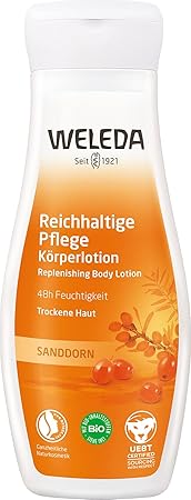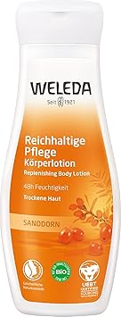 48H MOISTURE: The rich texture of the sea buckthorn body lotion provides the skin with intensive moisture for up to 48 hours. The body care lotion reduces tension and protects the skin from drying out For dry skin: thanks to the special ingredients of the vegan care lotion, the natural skin balance is strengthened. While organic sea buckthorn oil strengthens the skin's own protective barrier, organic argan oil promotes the regeneration of the skin barrier. Additional organic sesame oil nourishes the skin supple Fragrance from home perfumers: the fragrance compositions with 100% natural fragrance raw materials (essential oils and/or plant extracts) provide a fruity sweet scent of grapefruit, mandarin and sandalwood Highest WELEDA quality: the nourishing body lotion contains only ingredients of 100% natural origin, is vegan and free from synthetic fragrances, dyes and preservatives as well as raw materials based on mineral oil. Skin compatibility and effectiveness are dermatologically tested and confirmed Box contents: 1 x WELEDA rich sea buckthorn body lotion for the care of dry skin - natural cosmetics unisex body lotion with fruity sweet fragrance for women and men Product Description WELEDA Organic Sea Buckthorn Rich Care Body Lotion Protects the skin against moisture loss for up to 48 hours. The WELEDA Sea Buckthorn Body Lotion is specially designed for dry skin and restores the skin's natural moisture balance. The rich lotion provides intensive care and long-lasting moisture and strengthens the skin barrier. While organic sea buckthorn oil strengthens the