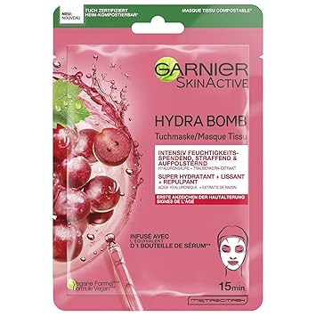 Garnier Hydra Bomb cloth mask with natural ingredients for use at the first signs of skin ageing, adapts to any facial contour, made of natural cotton fabric Result: Intensive moisture and care for the skin, reduces wrinkles, firmer and more youthful looking skin Directions for use: place the white side of the mask on the face, remove the blue film, adjust the mask to the face and leave for 15 minutes, after removing the residues gently massage Formula with grape seed extract, hyaluronic acid and a moisturising serum, visible results after 15 minutes exposure time Box contents: 1x Garnier SkinActive Hydra Bomb cloth mask with grape seed extract and hyaluronic acid, 28 g Product Description Facial skin prone to signs of premature ageing often appears less taut and defined. Then it needs care that reduces wrinkles and nourishes the skin. The Garnier SkinActive Hydra Bomb cloth mask with grape seed extract and hyaluronic acid provides the skin with deep moisture. The highly effective ingredients also ensure smoothed wrinkles and fine lines - for more youthfulness. Grape seed extract achieves an effective anti-ageing effect. The skin-rejuvenating cloth mask adapts to any facial contour and unfolds its effect within 15 minutes of exposure time. Manufacturer Contact Information 14, Rue Royale FR-75008 Paris