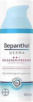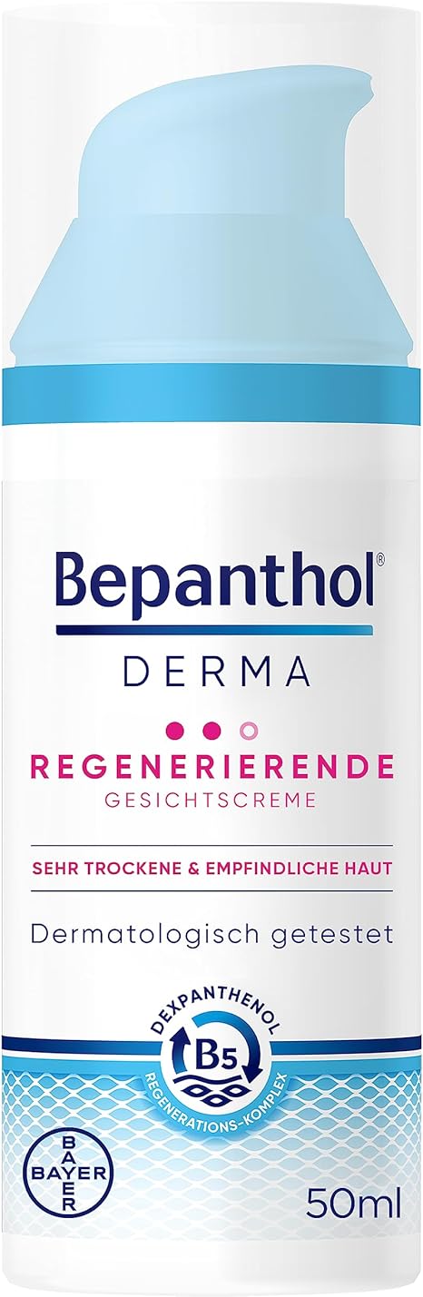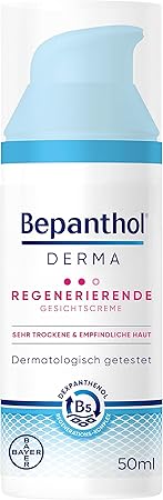 Regenerating face cream The rich, non-greasy formula intensively nourishes, relieves tension and absorbs quickly. It moisturises and protects against drying out - for delicate and supple skin. It is perfect for sensitive and very dry skin It contains the B5 regeneration complex with dexpanthenol, niacinamide (vitamin B3), natural lipids such as shea butter and argan oil, physiological lipid and glycerine supports the regeneration of the skin - from the inside to the outside The unique combination of ingredients is one of the main causes of dryness in deeper skin layers The cream is clinically tested for effectiveness and compatibility. 90% of ingredients are of natural origin. It is non-comedogenic The regenerating face cream is a dermatologically tested medical skin care from Bepanthen - scientifically based and recommended by professionals Product Description The rich, non-greasy formula of the BEPANTHOL Derma regenerating face cream intensively nourishes and absorbs quickly. It moisturises and protects against drying out - for delicate and supple skin. The face cream is perfect for sensitive and very dry skin. It has an immediate calming effect and relieves tension. The B5 regeneration complex supports the regeneration of the skin - from the inside to the outside. Dexpanthenol promotes natural cell regeneration in deeper skin layers of the epidermis. The glycerine contained provides instant and long-lasting moisture. Niacinamide (Vitamin B3) soothes itchy, dry skin and natural lipids such as shea butter and argan oil complement missing skin lipids. The phy