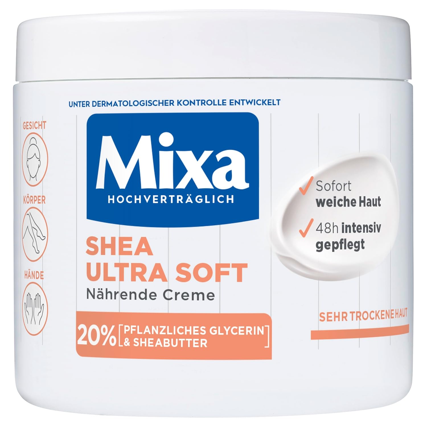 All-purpose cream for use on the face, body and hands, suitable for very dry and sensitive skin of babies, children and adults Result: 48-hour long-lasting hydration and suppleness, protection against rough skin and delicate skin feeling for the whole family Application: nourishing moisturiser suitable for daily use on the face, hands as well as for the whole body, repeat as desired Highly compatible, gentle and non-greasy formula with 20% moisturising, vegetable glycerine and nourishing shea butter Box contents: 1 x Mixa Shea Intensive nourishing cream with 20% vegetable glycerine and shea butter for very dry skin, for face, body and hands, contents: 400 ml Product Description The Mixa Shea Ultra Soft Nourishing Cream is the ultimate solution for very dry and demanding skin that needs intensive care and long-lasting suppleness. This rich cream has been specially formulated to moisturise the skin for up to 48 hours and nourish it sustainably, leaving it feeling soft and supple again. Their highly compatible formula makes it the ideal care for the whole family - from the smallest to the adults. At the heart of this exceptional cream is the unique combination of 20% vegetable glycerin, known for its excellent moisturising properties, and nourishing shea butter. These powerful ingredients work synergistically to intensively nourish the skin, restore its moisture balance and strengthen the natural skin barrier. Whether on the face, body or hands, the Mixa Shea Ultra Soft nourishing cream provides comprehensive care that absorbs immediately without greasing. It le