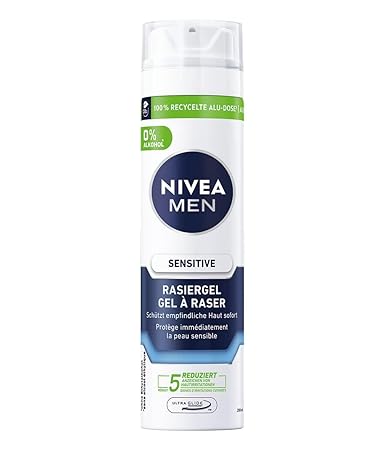 Sensitive shaving gel - The NIVEA MEN shaving gel ensures a mild shave and allows the razor blades to glide smoothly thanks to the Ultra Glide Technology. For sensitive skin - The shaving gel reduces the 5 signs of skin irritation: burning, redness, dryness, tightness and small cuts. Nourishing formula - The fragrance-neutral formula of the men's shaving gel with chamomile, witch hazel and vitamin E protects sensitive skin immediately, without alcohol. Skin and environment - For the love of skin and the environment, the tin is made from 100% recycled aluminium*, so 35% less CO2 emissions** are required. Box contents and details: NIVEA MEN Sensitive shaving gel (200 ml), shaving gel with chamomile, witch hazel and vitamin E for a gentle shave, item number 81720 Product Description NIVEA MEN Sensitive Shaving Gel - For Sensitive Skin The NIVEA MEN Sensitive shaving gel provides a gentle, nourishing shave and reduces the 5 signs of skin irritation: burning, redness, dryness, tightness and minor cuts. The gel protects and nourishes the skin thanks to its mild, fragrance-neutral formula with chamomile, witch hazel and vitamin E. Thanks to the Ultra Glide technology, the shaving gel also allows gentle gliding of the blades. For sensitive men's skin: NIVEA MEN Sensitive shaving gel. For the love of skin and the environment, the tin is made from 100% recycled aluminium*, so 35% less CO2 emissions** are required. How to use: Apply a small amount of gel to the palm of your hand and apply directly to moistened skin and massage in. The product advantages in detail: Gentl