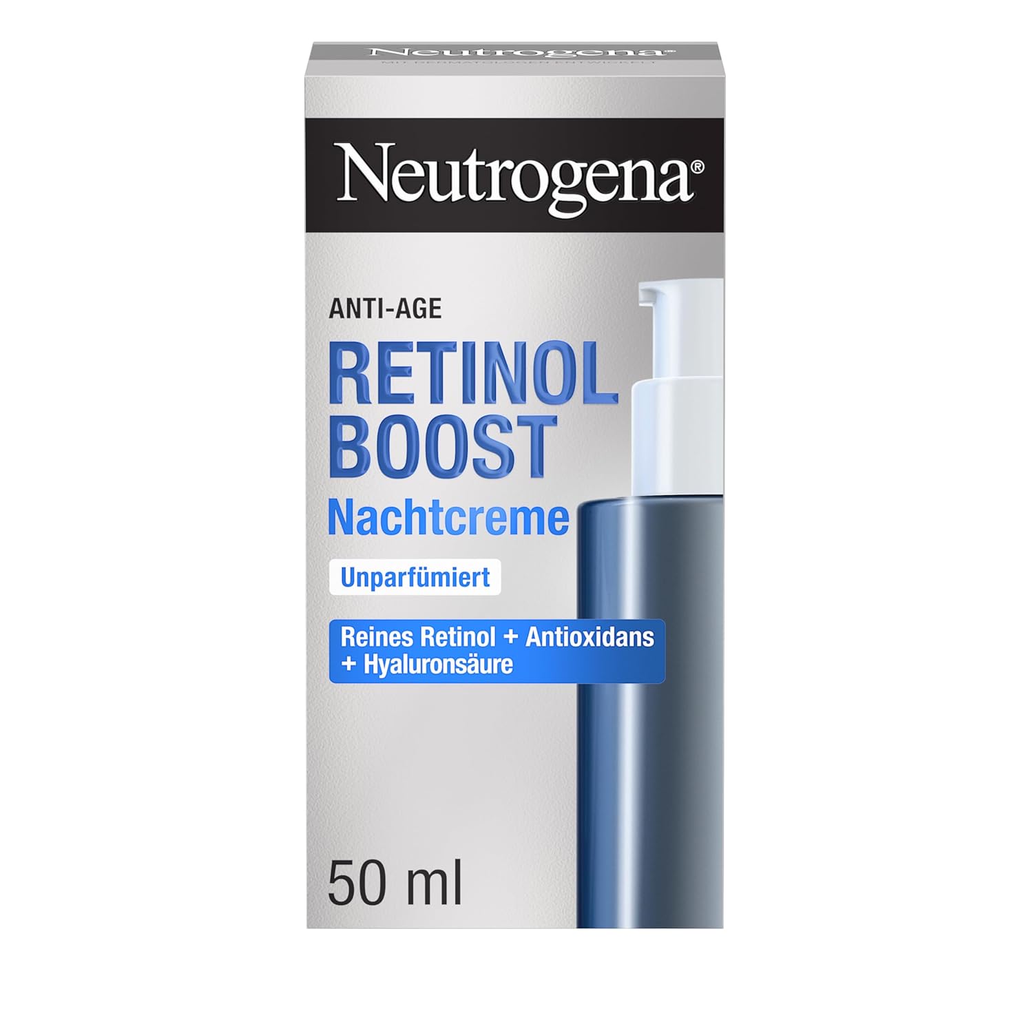 Anti-ageing face care - The retinol cream releases pure retinol in the skin surface to improve the appearance of the skin and effectively combat visible signs of skin ageing Moisturising night cream - The Neutrogena face cream instantly moisturises for smoother skin overnight, improves the complexion over time and reduces wrinkles and pigment spots Visible results - The skin care is so effective that a visible effect has been confirmed in 100% of testers (*Scientific evaluation by dermatologists with 39 subjects, 1 x daily use) Retinol Boost - With their unique formula of pure, highly effective retinol, myrtle leaf extract and hyaluronic acid, the products of the Retinol Boost series from Neutrogena fight visible signs of skin ageing Box contents: 1 x 50 ml Neutrogena Retinol Boost night cream, fast absorbing and lightweight anti-wrinkle cream with a retinol content of 0.1% Product Description Neutrogena Retinol Boost Night Cream - Light Face Cream for Improved Skin Complexion The Neutrogena Retinol Boost Night Cream is a fast-absorbing anti-ageing moisturiser with retinol, myrtle leaf extract & hyaluronic acid and ensures younger and healthy-looking skin. The effective face cream combats visible signs of ageing: wrinkles, reduced firmness, tired skin, dryness and pigment spots. In addition, the cream improves the complexion and ensures an even skin tone. The unique formula combines pure retinol to promote collagen production, myrtle leaf extract to increase retinol effectiveness and hyaluronic acid for intense moisture and plump skin. The anti-ageing day cre