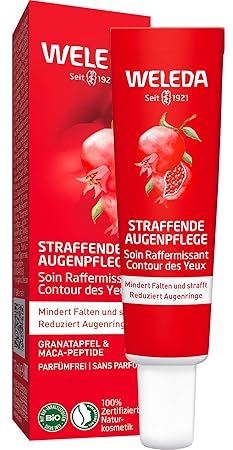 Invigorates the eye area: the unscented eye care protects the sensitive eye area from harmful environmental influences and ensures a radiantly awake look. It reduces wrinkles and lines, nourishes the skin and improves the elasticity and elasticity of demanding skin from 40. Reduces eye rings and puffiness: the active ingredient combination of antioxidant organic pomegranate seed oil and organic maca peptides supports the skin's natural regeneration process. The skin-soothing care improves the elasticity of sensitive skin in the eye area and allows it to shine naturally Ideal for daily skin care: spread a pearl-sized amount between the middle and ring fingertips in the morning and evening and gently pat around the eye area. Also ideal for contact lens wearers Highest WELEDA quality: free from synthetic fragrances, colours and preservatives as well as mineral oil-based raw materials, the moisturiser ensures visibly firmer skin around the eyes. The cream is 100% vegan and skin compatibility is dermatologically and ophthalmologically tested Box contents: 1x WELEDA firming natural anti-ageing eye care. Regenerating formula of organic pomegranate seed oil and peptides of the organic maca root naturally counteracts the ageing process of the skin for demanding skin from 40 years (1 x 12 ml) Product Description WELEDA Organic Firming Eye Care Vegan anti-ageing eye cream especially for skin from 40 Demanding skin needs sophisticated care. The firming eye cream from WELEDA reduces the signs of ageing and naturally counteracts the ageing process of the skin with a regene