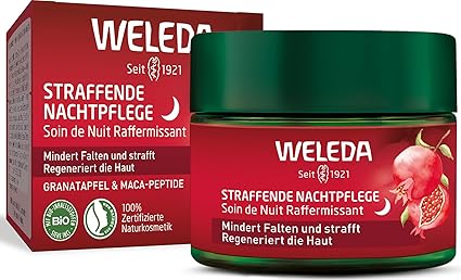 Activates cell renewal - The rich facial cream with uplifting nutrients activates the natural regeneration processes during the night. It reduces wrinkles and lines, intensively nourishes the skin and improves the elasticity and elasticity of the demanding skin from 40. Naturally counteracts the ageing process of the skin More elasticity and elasticity: the combination of antioxidant organic pomegranate seed oil and organic maca peptides supports the skin's natural regeneration process. The skin is moisturised and is more elastic. She looks refreshed after waking up in the morning and feels taut Ideal for daily skin care: the rich night cream can be applied to the face, neck and décolleté in the evening after cleansing and after the firming facial serum. The sensually scented facial care takes you on an exotic journey. While the fresh nuances of orange invigorate the senses, the velvety balsamic note of vanilla gives depth and sweetness Highest WELEDA quality: free from synthetic fragrances, colours and preservatives as well as mineral oil-based raw materials, the firming moisturiser ensures firmer skin that radiates naturally. The cream is 100% vegan and skin compatibility is dermatologically tested Box contents: 1 x WELEDA firming natural anti-ageing night care. Regenerating formula of organic pomegranate seed oil and peptides of the organic maca root naturally counteracts the ageing process of the skin for demanding skin from 40 years (1 x 40 ml) Product Description WELEDA Organic Firming Night Cream Vegan anti-ageing night cream especially for skin from 4