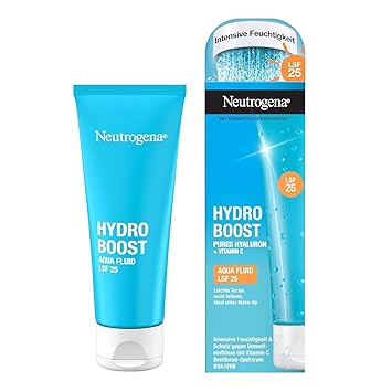 Intensive face care - The ultra-light Neutrogena face cream provides the skin with intense moisture, is non-greasy and is ideal under make-up With hyaluronic acid and vitamin C - The moisturising hyaluronic cream protects against environmental influences thanks to antioxidant vitamin C and gives a radiant complexion Helioplex SPF 25 - Thanks to sun protection factor 25 broad spectrum protection, the moisturiser effectively protects against harmful UVA and UVB rays and is perfect as a day cream Hydro Boost - With hyaluronic acid and other nourishing ingredients, the products of the Neutrogena Hydro Boost series intensively moisturise all skin types Box contents: 1 x 50 ml Neutrogena Hydro Boost Aqua Fluid SPF 25, non-greasy skin care with ultra-light texture, does not clog pores thanks to effective ingredients Product Description Neutrogena Hydro Boost Aqua Fluid SPF 25 - Provides the skin with intense moisture The Neutrogena Hydro Boost Aqua Fluid SPF 25 is a very light, non-greasy face care with SPF 25. Thanks to the effective formula with hyaluronic acid, the face cream intensively moisturises dry skin and protects against environmental influences thanks to vitamin C. Subject-confirmed results*: 77% found that the skin looks more radiant with daily use and 100% confirm an ultra-light texture. Application: apply twice daily. The ultra-light and non-greasy texture is ideal to use as a base before makeup as a final step in the facial care routine. The product advantages in detail: Light day cream with SPF 25 Provides the skin with intensive moisture. Ultra-lig