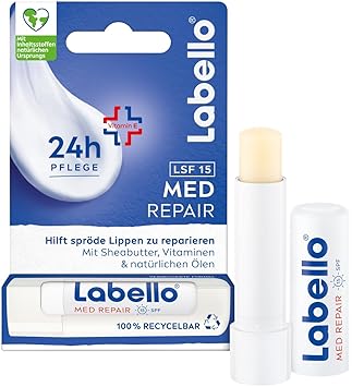 Intensive care - The lip balm provides dry and cracked lips 24 hours of intensive care, helps repair them and protect them from drying out. Effective formula - The formula with shea butter and vitamin E creates an invisible protective layer and provides instant relief for stressed lips. With UV protection - The care stick with natural oils gives the lips a colourless finish and offers additional effective UVA/UVB protection thanks to SPF 15. Easy to use - The Labello lip care can be used several times a day as needed. Skin compatibility is dermatologically tested Box contents and details - Labello Med Repair lip balm, 4.8 g, repairing lip care for very brittle lips, mineral oil-free sun protection for the lips, item no. 85050 Product Description Labello Med Repair SPF 15 and Vitamin E Lip Care Dry and brittle lips nourish with Labello Med Repair. The unique formula with natural ingredients such as shea butter, vitamin E and natural oils provides intensive care for 24 hours, helps repair brittle lips and protects them from cold, wind and dry air. The lips are coated with an invisible protective layer and can be intensively nourished and healed - without mineral oils. The additional UVA/UVB protection with SPF 15 protects lips from UVA and UVB rays. The lip balm gives the lips a colourless finish and impresses with its subtle fragrance. Skin compatibility is dermatologically tested. For soft and healthy looking lips: Labello Med Repair Application: The care pen can be used several times a day as needed. Apply Labello Med Repair gently and evenly to the lips and