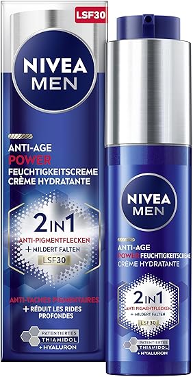 Highly effective formula - The NIVEA MEN day cream with SPF 30 visibly reduces the size and intensity of pigment and age spots as well as deep wrinkles. Double effect - The anti-ageing face care combines highly effective hyaluronic and Luminous-630 and ensures younger-looking skin in just 4 weeks. Patented active ingredient - After 10 years of intensive research, Nivea has developed the highly effective active ingredient LUMINOUS630 for the reduction of pigment spots. 24 hour moisture - The lightweight formula of the day cream for men against pigment spots and wrinkles is suitable for all skin types and provides 24 hours of moisture. Box contents and details - NIVEA MEN Anti-Age 2-in-1 Power Moisturising Cream, 50 ml, Nivea Luminous Anti-Pigment Spot Day Cream, Face Care for Men with Anti-Ageing Effect, Item No. 98782 Product Description NIVEA MEN anti-ageing 2-in-1 power moisturising cream combines highly effective Hyaluronic with the patented anti-pigment active ingredient Luminouus630 to reduce pigment spots and wrinkles. The lightweight formula absorbs quickly and provides 24 hours of intensive moisture. In addition, SPF30 and UVA/UVB filters protect against premature light-induced skin ageing and the formation of new pigment and age spots. The moisturiser is suitable for all skin types and skin tones. Ensures younger looking skin in just 4 weeks: NIVEA MEN Anti-Age 2-in-1 Power Moisturising Cream. ✓ SPF30 sun protection ✓ Visibly reduces deep wrinkles ✓ Reduces size and intensity of pigment and age spots Younger looking skin in just 4 weeks