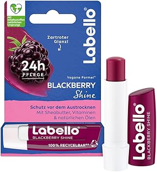 Blackberry Shine - The care pen with ingredients of natural origin provides intensive moisture and gives the lips a soft red finish. Natural oils - The Labello lip balm with its formula of shea butter, vitamins and natural oils protects the lips from drying out for 24 hours. With blackberry aroma - The blackberry aroma care pen gives the lips a soft red shine and envelops them with an exciting fruity fragrance. Easy to use - The delicate Labello lip care can be used several times a day as needed. Skin compatibility is dermatologically tested. Box contents & details - Labello Blackberry Shine, 4.8 g, mineral oil-free lip care for dry lips with blackberry aroma, coloured lip care for a soft red lip finish, item no. 85285 Product Description Labello Blackberry Shine - Lip Care with Soft Red Shine Pamper your lips with Labello Blackberry Shine. The formula with natural oils and blackberry aroma provides 24 hours of care and protects it from drying out - without mineral oils. The lip balm gives your lips a soft red shine and envelops them with an exciting berry fragrance. Skin compatibility is dermatologically tested. For fresh-looking and noticeably nourished lips: Labello Blackberry Shine. Application: The care pen can be used several times a day as needed. Apply Labello Blackberry Shine gently and evenly to the lips and repeat regularly for dry lips. Sustainability: The mineral oil-free lip balm with vegan formula* contains socially responsible shea butter**. The packaging is made from recycled cardboard - designed for recycling. Labello is committed to a world