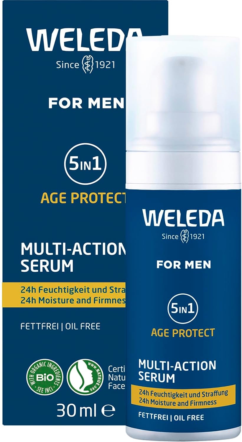 Reduces signs of skin ageing: the fat-free face care serum reduces wrinkles and lines, provides immediate intensive moisture and improves the elasticity and elasticity of the skin. The moisturising serum naturally counteracts the ageing process of the skin, stimulates cell renewal and protects the skin from free radicals Strengthens the skin structure: the combination of antioxidant pomegranate juice and sloe extract activate the cellular renewal of the skin. Additional aloe vera nourishes the skin and provides it with intensive moisture for 24 hours. Skin feels fresh, firm and elastic Ideal for daily skin care: the serum can be gently tapped into cleansed skin. Especially for dry skin, the care serum can be supplemented with the For Men moisturising cream Highest WELEDA quality: the lightweight 5-in-1 face serum for men is vegan and free from synthetic fragrances, dyes and preservatives, microplastic ingredients as well as mineral oil-based raw materials. Skin compatibility is clinically confirmed Box contents: 1 x WELEDA Bio for Men 5-in-1 Age Protect anti-ageing serum provides 24 hours of intensive moisture and reduces wrinkles. Grease-free natural cosmetics face care for men Product Description WELEDA Bio For Men 5-in-1 Age Protect Multi Action Serum Vegan anti-ageing face serum especially for men The fat-free 5-in-1 face care serum is the ideal addition to your daily facial care routine. The firming serum from WELEDA reduces the signs of ageing and naturally counteracts the ageing process of the skin with a regenerating combination of active ingredients.