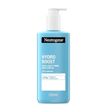 Absorbs immediately - The NeutrogenaHydro Boost Body Lotion Gel with the ultra-light formula for all skin types scientifically proven absorbs immediately without leaving a greasy film, so you can dress immediately after cream. To support a strong skin barrier - The formula of the instantly refreshing body lotion gel, enriched with 17% glycerine and the super moisturiser hyaluronic acid, maintains the moisture balance of the skin and provides intensive moisture for 72 hours. For supple, radiant skin - After using this instantly absorbing skin care lotion gel, 90% of testers felt that their skin was noticeably smoother. (*Self-assessment of 62 testers: inside, after 4 weeks) Developed with dermatologists - The skin cream in a practical pump dispenser is also suitable for sensitive skin thanks to the highly compatible formula. Box contents: 1 x 250 ml Neutrogena Hydro Boost ultra-light body lotion gel with the super moisture dispenser hyaluronic acid for 72 hours of intensive moisture Product Description The refreshing Neutrogena Hydro Boost body lotion gel with the ultra-light formula is scientifically proven to absorb immediately and ensures supple, radiant skin. Enriched with hyaluronic acid super moisturiser, the formula maintains the skin's moisture balance & releases moisture exactly when the skin needs it - to support a strong skin barrier. After applying the body lotion gel in a practical pump dispenser, 90% of the testers felt that their skin was noticeably smoother. The formula absorbs immediately without leaving a greasy film, so you can dress right a