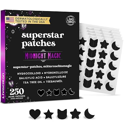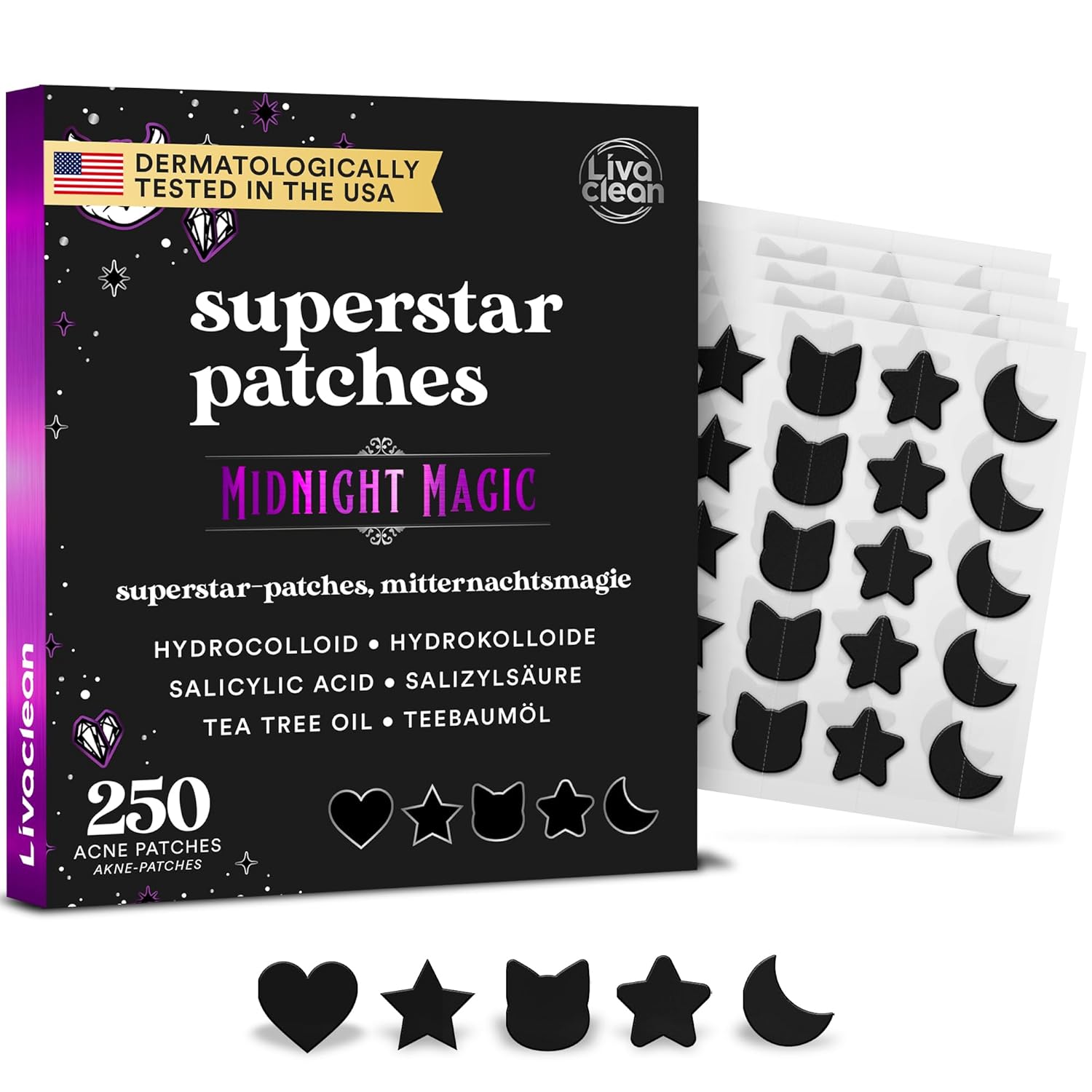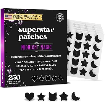 250 Black Pimple Patches - In 5 cute star shapes (14mm), ideal for teenagers & women. Our pimple patches with & tea tree oil effectively absorb oil and impurities overnight. Anti-pimple patches with hydrocolloid - promote natural healing and protect against dirt and touch. Ideal for pimples, blackheads and blemishes on the face. Pimple patches for face - Our thin pimple patches adhere reliably, even when sleeping or sweating. No slipping, no re-gluing required. Pimple patch with strong adhesion - Waterproof pimple patch sticker for active pimples. Ultra thin, breathable and suitable for all skin types - even when cleaning or sweat. Stylish Star Acne Patches - TikTok Skincare Trend Fun meets function with star-shaped black acne stickers in 5 cute designs. Add style to skincare with these pimple patch cute essentials—perfect for selfies & social content. WON'T FALL OFF - STAYS ON FACE: These star pimple patches, pimple patches, pimple patches, black pimple patch stickers for face stick through sweat, sleep, and showers—ideal for acne patch, pimple patch face, and anti pimple patches use.