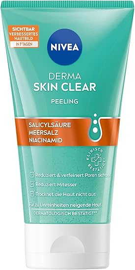 Derma Skin Clear - The clarifying NIVEA Derma Skin Clear facial scrub refines pores and reduces blackheads without drying out the skin. Blemished skin - The cleansing facial care with salicylic acid, sea salt and niacinamide has been specially developed for blemish-prone skin. Against blackheads - The NIVEA facial cleanser is suitable as a face and body scrub and visibly improves the complexion in 7 days. Skin & Environment - The BHA scrub has a clinically* & dermatologically confirmed formula that is 99% biodegradable for love for skin and environment. Box contents and details: NIVEA Derma Skin Clear peeling, 150 ml, deep pore cleansing with salicylic acid, anti-blackhead peeling for a visibly refined complexion, item no. 98757 Product Description NIVEA Derma Skin Clear Exfoliating - visibly improved complexion in just 7 days The NIVEA Derma Skin Clear Exfoliator has been specially developed for blemish-prone skin. Dead skin that deposits on the skin surface clogs our pores and forms blackheads. Regular use of the NIVEA Derma Skin Clear scrub visibly reduces and refines pores and reduces the appearance of blackheads. It has been specially developed for blemish-prone skin and contains salicylic acid, sea salt and niacinamide. It is suitable for face and body and refines the complexion without drying out the skin. For a visibly improved complexion in 7 days: NIVEA Derma Skin Clear peeling. The blemished skin scrub is part of the Derma Skin Clear series and can be used together with the entire NIVEA series for every step of the skincare routine. The facial clea