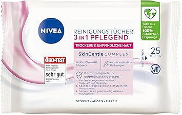 Gentle cleaning - The NIVEA make-up wipes with almond oil remove waterproof make-up thoroughly but mild, moisturise and protect against drying out. Sensitive Skin - The new SkinGentle Complex formula with pro-vitamin B5 and glycerine provides an intensive cleansing effect without irritating the skin. Proven effect - Thanks to the mild formula and soft cloths, the NIVEA facial cleansing wipes gently cleanse the skin, confirm 91%*. Skin & Environment - The cloths are made from cloth fibres of 100% natural origin and the microplastic-free formula consists of 97% ingredients of natural origin***. Box contents and details: NIVEA cleaning cloths 3-in-1 nourishing, pack of 25, make-up wipes for sensitive skin, make-up remover for face, eyes and lips, item no. 81906 Product Description NIVEA cleaning cloths 3-in-1 nourishing - for dry and sensitive skin The NIVEA cleaning cloths 3-in-1 nourishing clean particularly thoroughly but at the same time very mild and are therefore perfectly adapted to the needs of dry and sensitive skin. The make-up wipes for waterproof make-up and mascara not only clean particularly gently, but moisturise the facial skin, protect it from drying out and provide a supple soft skin feeling with almond oil. Thanks to the SkinGentle Complex formula with pro-vitamin B5 and glycerine, the wipes offer an intensive cleansing effect without irritating the skin. 91% confirm that the make-up removal wipes gently cleanse the skin and 94% confirm that they care for the skin*. The NIVEA cleaning cloths 3-in-1 nourishing are dermatologically and ophthalmo