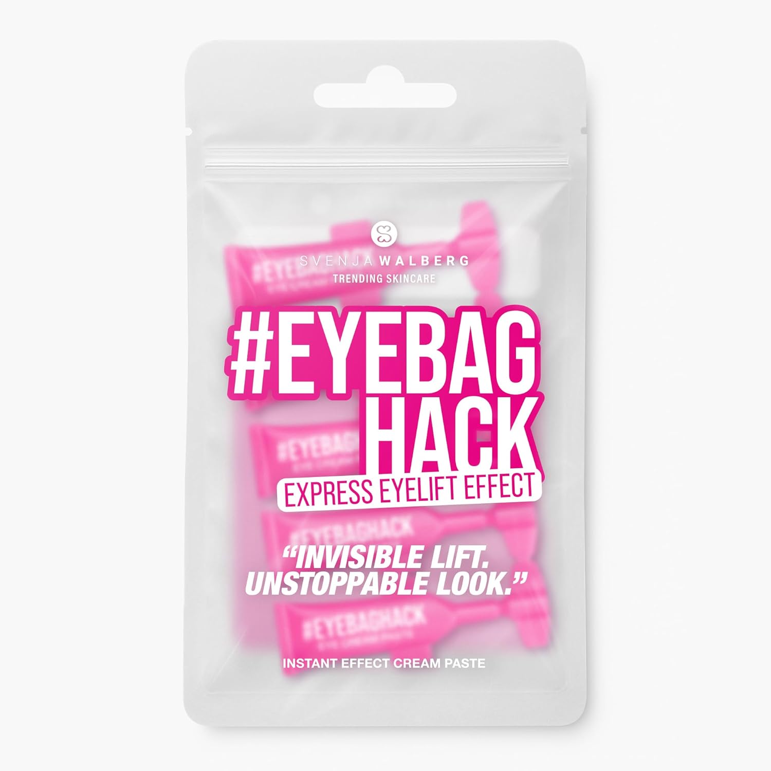 The 2-minute knit – Bye-bye bags and wrinkles. Thanks to the Invisible Flex Film Technology, #EYEBAGHACK smooths the eye area in seconds and provides a fresh, awake look - up to 10 hours. Instant fresh eyes - Perfect for everyday life, events and selfies. Simply apply, wait 2 minutes and fine lines and bags disappear visibly for a youthful, radiant look. Invisible and effective - The transparent, firming formula absorbs quickly and leaves no residue or white film. Ideal for all skin types and makeup compatible. Practical and handy - Packed in mini tubes, EYEBAGHACK is the perfect companion for on the go. 5 x 1ml resealable tubes are enough for 5-10 applications per tube. Easy to use - Clean face, apply care, gently tap in EYEBAGHACK & wait 2 minutes. For fresh eyes whenever you want – whether in the office, on a date or in the video call.