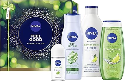 Beauty set - Includes NIVEA Lemongrass & Oil shower gel, 2-in-1 express shampoo & conditioner, lemongrass & care body lotion and fresh pure deodorant for daily good mood. Refreshing shower - NIVEA Lemongrass & Oil shower gel with oil beads and NIVEA 2-in-1 Express Shampoo & Conditioner provide an energy boost in the shower. 72H Moisture - The NIVEA Lemongrass & Care Body Lotion with natural sesame oil, lemongrass fragrance and deep care serum provides 72 hours of intensive moisture. Reliable 48-hour fresh feeling - The NIVEA Fresh Pure deodorant without aluminium (ACH) with jasmine fragrance offers long-lasting deodorant protection thanks to the NIVEA Infinifresh formula. Box contents and details: NIVEA Feel Good gift set including shower gel (250 ml), shampoo (250 ml), body lotion (400 ml) and deodorant (50 ml), item no. 93930